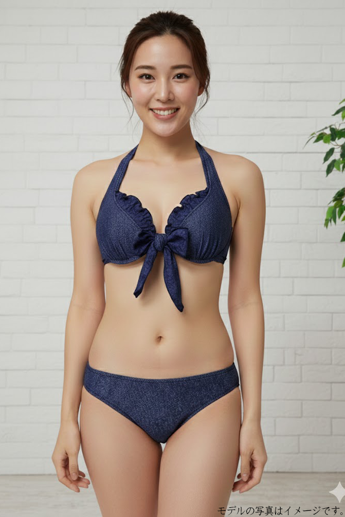 1297 使用済み 水着 中古 ビキニ3点セット デニム調プリント 紺系 9M
