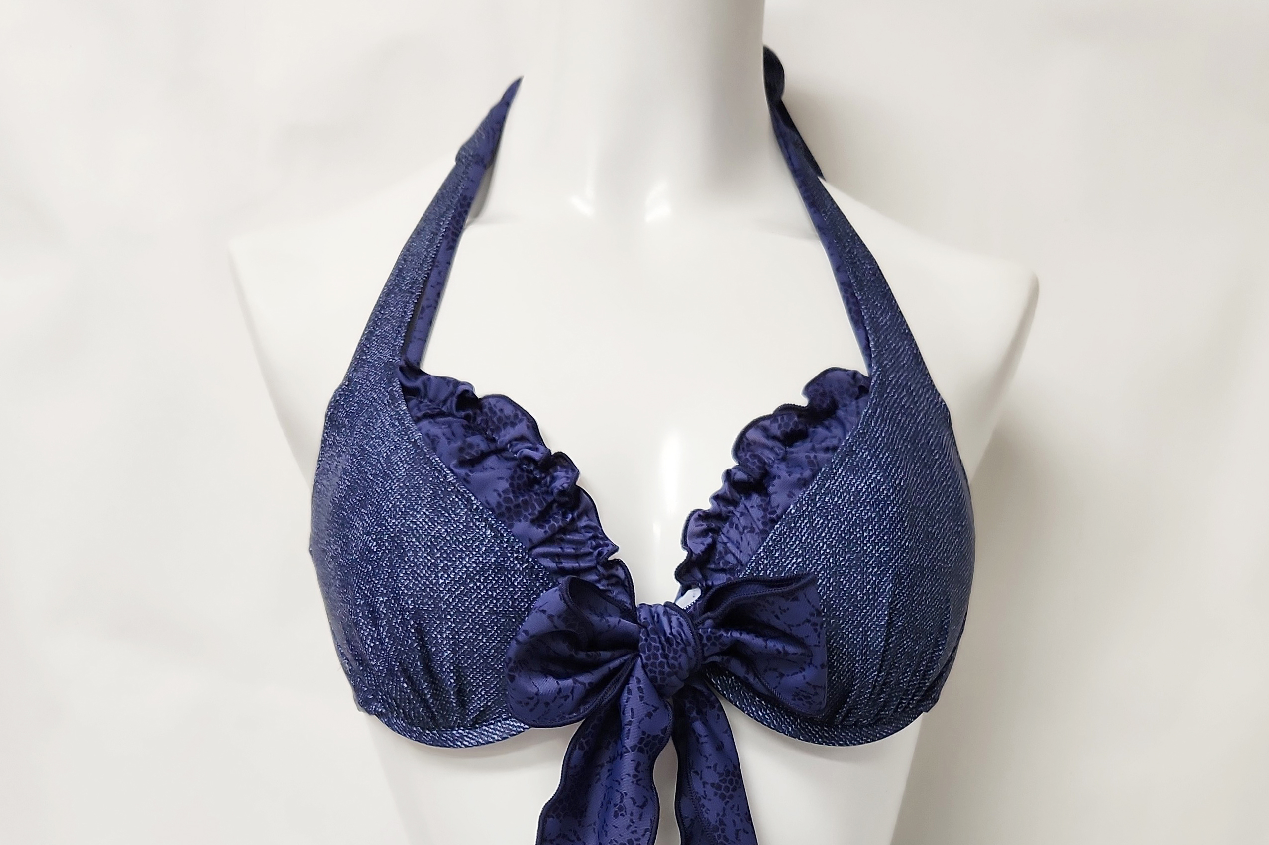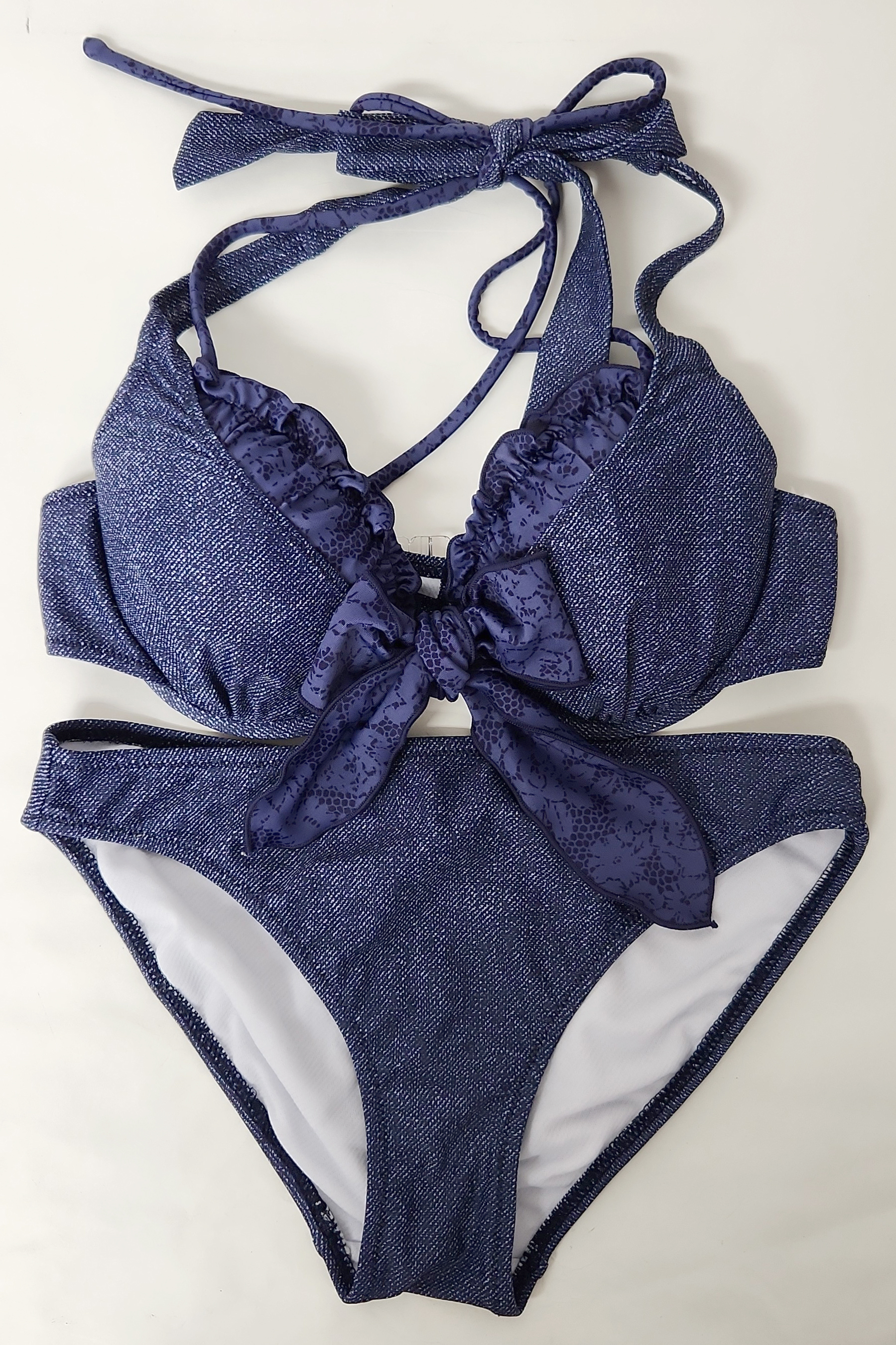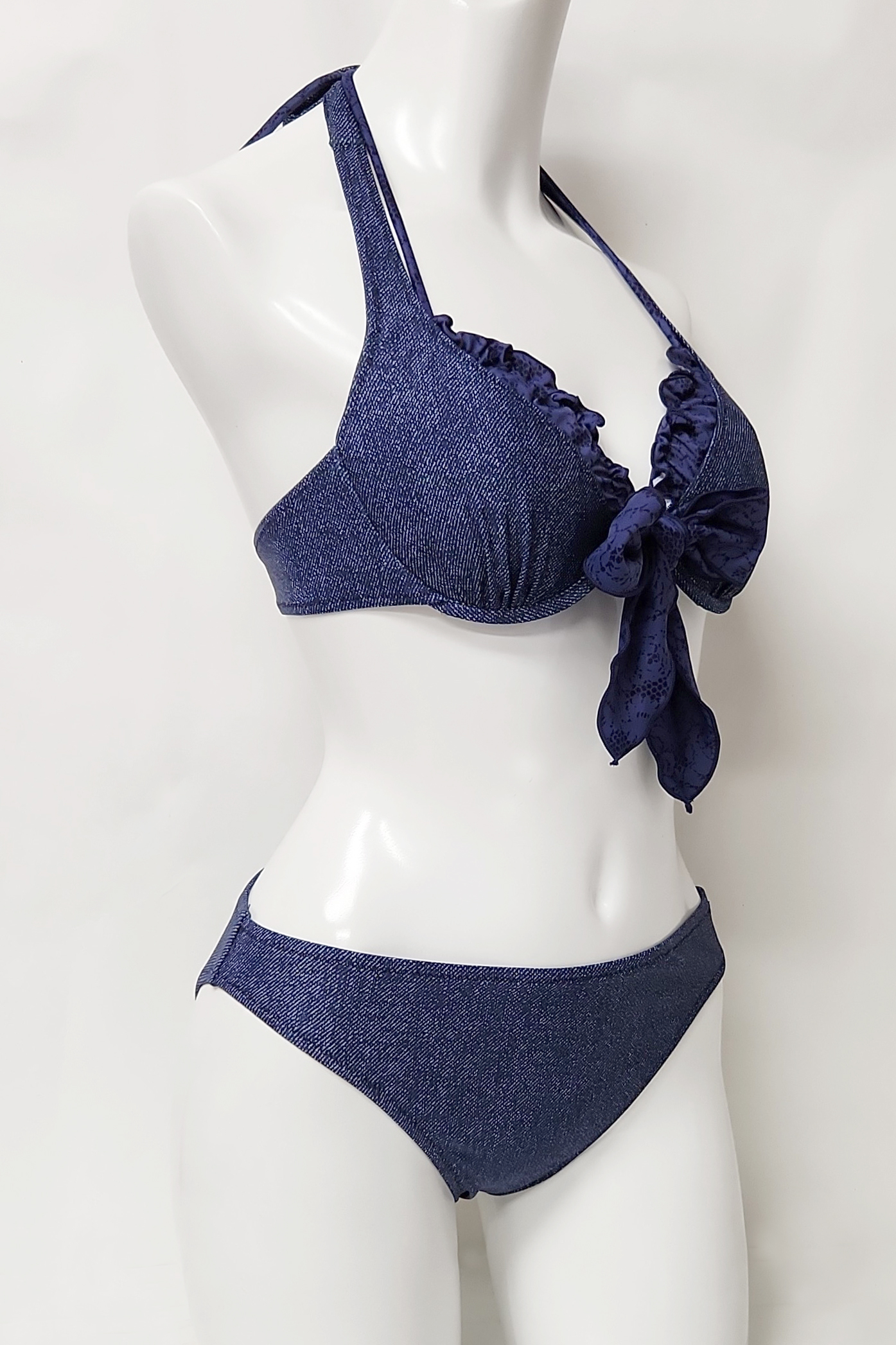 1297 使用済み 水着  中古  ビキニ3点セット デニム調プリント 紺系 9M