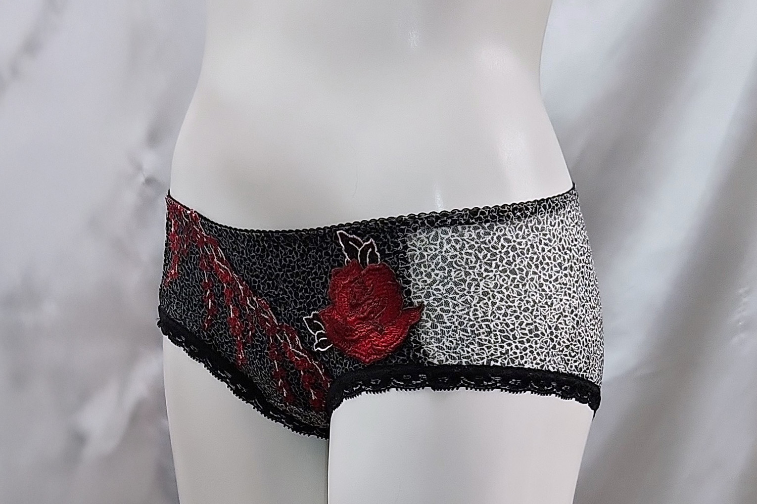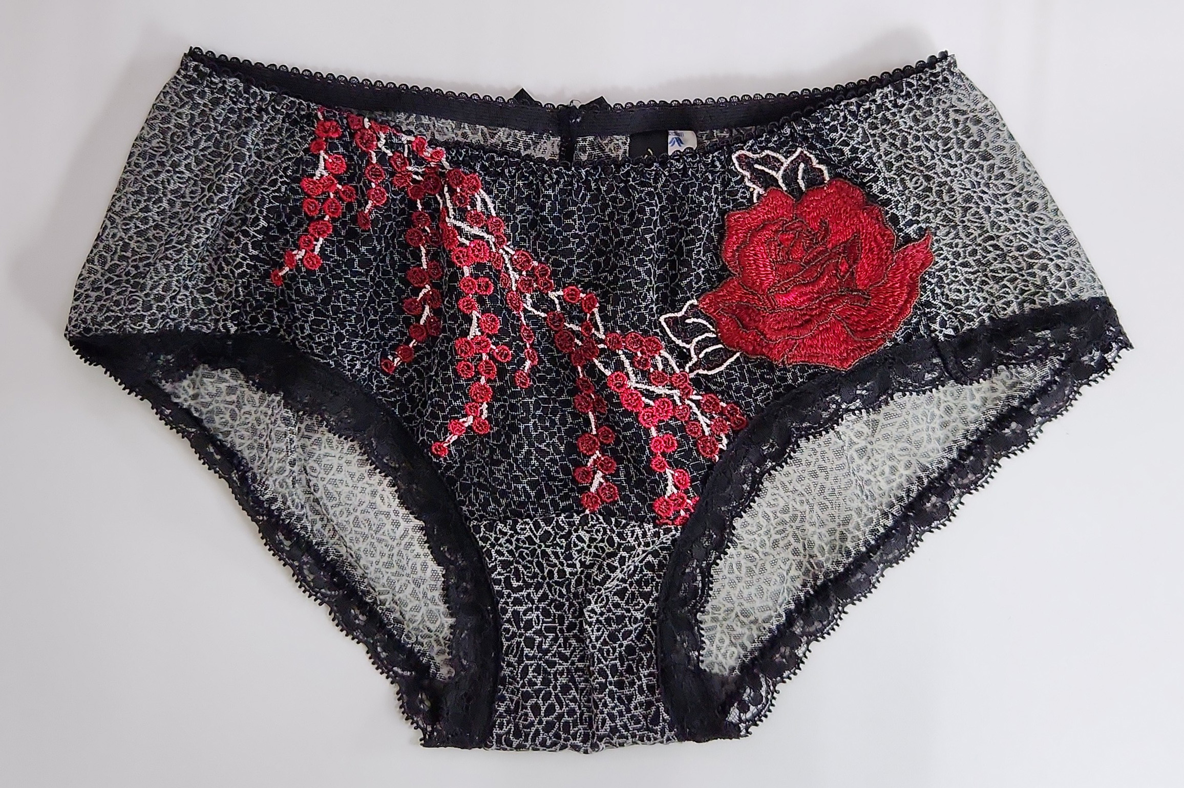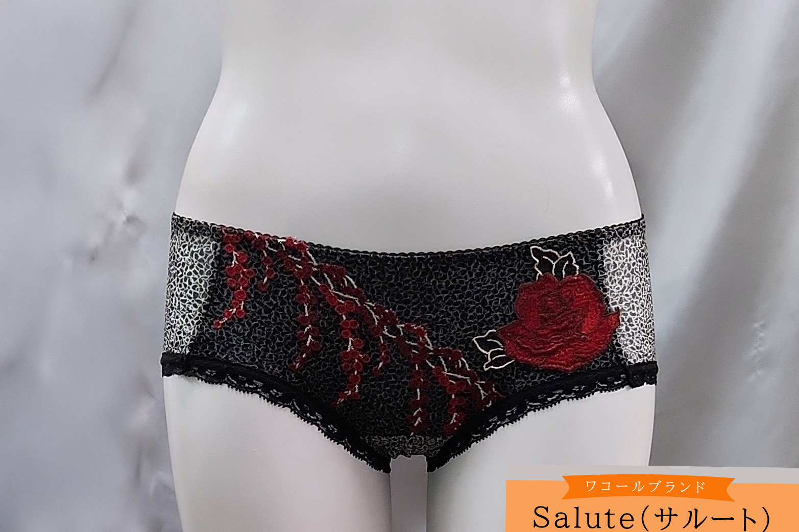 お姉さんが履いたフロントが艶やかなバラの刺繍のハーフバックショーツです。